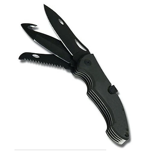 Ce couteau 3 lames comprend une lame droite tranchante, une lame scie et une lame coupe sangle. Chaque lame se bloque par un cran d’arret, avec fermeture sécurisé. Livrée dans un étui cordura noir à position verticale ou horizontale. Couleur: Noir.
