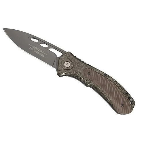 Couteau HERBERTZ, « TOP COLLECTION », lame à trous acier 440 revêtement titane gris à cran intérieur, manche 11,5 cm acier inserts G10 sable, avec clip.