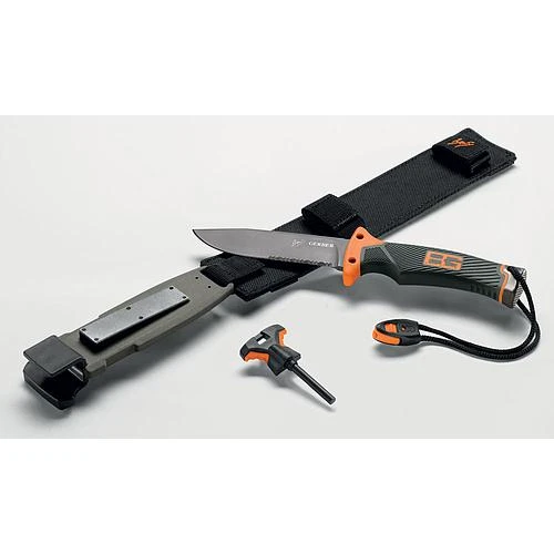 Le couteau Ultimate Bear Grylls est le seul couteau droit de cette gamme (lame DROP : arrondie vers l’extérieur) avec une partie de la lame semi denté. Le manche du couteau est en matière synthétique équipé d’une poignée antidérapante. Le passant au talon du couteau est en drisse de parachute qui porte un sifflet d’urgence.