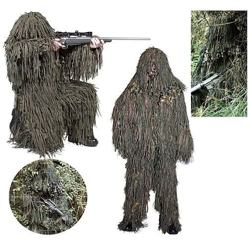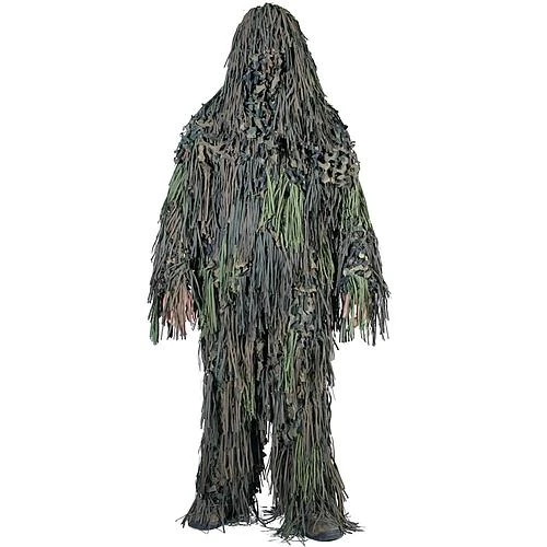 Le système de camouflage Ghillie Suit Jackal est fabriqué en 100% polyester. Il a une structure 3-D. Il est silencieux et ne produit aucun bruit de froissement.