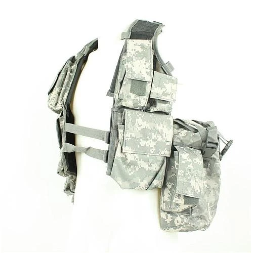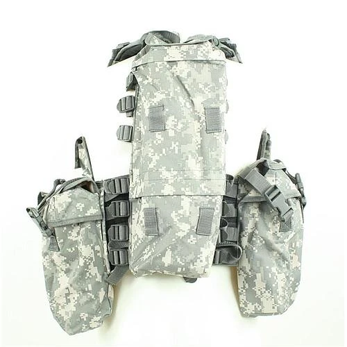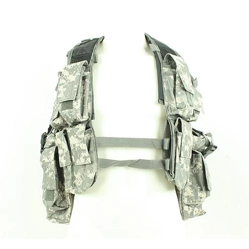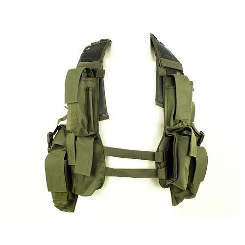 Gilet RSA . Gilet polyvalent avec 13 poches (6 emplacements pour chargeurs de 5.56, 3 poches multiple-usages, 2 petites poches à grenades et une musette dorsale en 2 parties). Il est entièrement réglable et possède des sangles de fixation pour équipements supplémentaires.