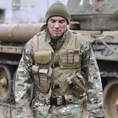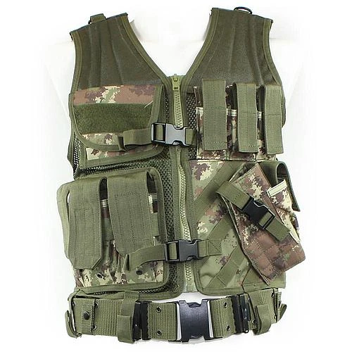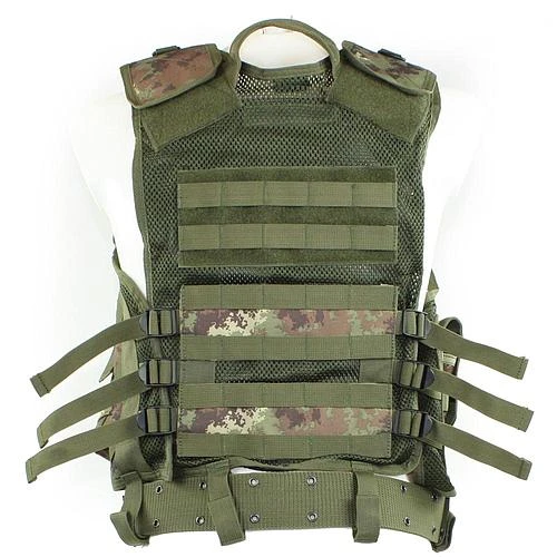 Gilet de combat en maille 100% polyester avec 7 poches disposant d’un zipper sur le devant, de 3 poches porte-chargeurs réglables, de 3 poches extérieures avec fermeture velcrod’une poche pour la boussole, de 2 poches intérieures et de 6 boucles de ceinture de raccord