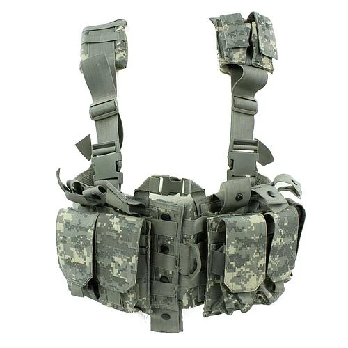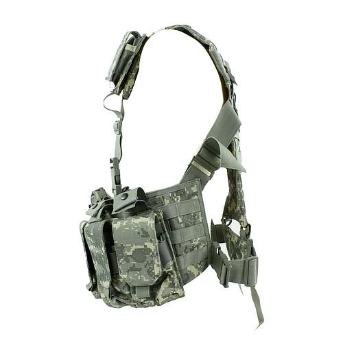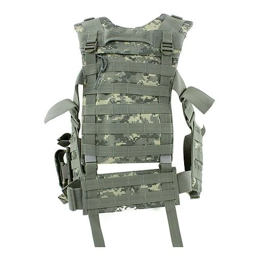 Harnais tactique AT Digital en nylon 600D. Il est entièrement équipé du système Molle. Il possède 2 poches pour chargeur de réplique de poing sur la bretelle droite ainsi que 11 poches pour chargeur AEG (6 inclus sur le gilet et 5 amovibles par système Molle). Le gilet possède également une poche dans le dos de 25 x 17cm avec fermeture à glissière. Poids : 1700g.