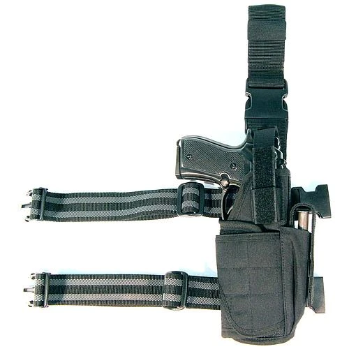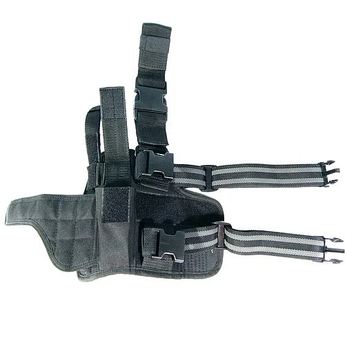 Il comporte 2 sangles de cuisse amovibles avec système anti-dérapant et une boucle-sécurité réglable. La patte de maintien, avec boucle-fermoir, s’adapte à toute taille de ceinturons. Elle permet le retrait rapide du holster.