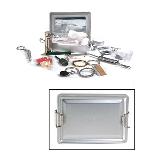 Kit de survie complet. Le kit comprend : 1 mirroir, 2 cotons, 4 épingles à nourrice, 1 crayon de papier, 1 bougie, 1 fil de fer, 1 boussole, 1 scie à main, 1 lame de rasoir, 1 capsule flottante de survie, 1 rouleau de sparadrap, 2 couteaux pliants, 1 ciseau, du sel, 1 pierre à feu, 1 couteau de cuisine, du papier, des pansements, des allumettes, des hameçons et un nécessaire de couture.