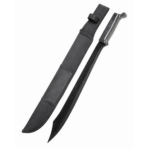 Cette machette possède une poignée est en plastique noir.