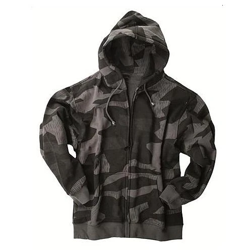 Veste à capuche 100 % coton couleur Black Camo avec fermeture éclair. La capuche est ajustable à l’aide de 2 cordons. 2 poches. Poignets en tricot