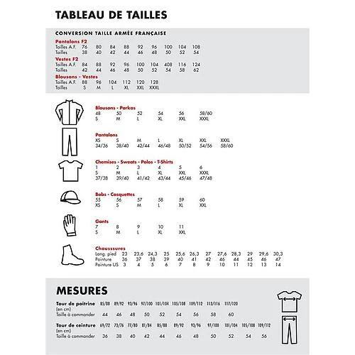 Très fonctionnel, le pantalon F2 dispose de 2 poches italiennes et de 2 poches avec soufflets fermées par des pressions. La braguette se ferme par fermeture à glissière. Pour assurer protection et confort, le bas des jambes est doté d’un serrage élastique et des renforts ont été prévus au niveau des genoux. Confortable et pratique, ce pantalon treillis convient aux militaires comme aux chasseurs, pêcheurs et à tous ceux qui veulent du confort pour leurs activités outdoor. Le pantalon F2 existe de la taille 72 à 128 et se décline en 2 longueurs: moyen 70 cm et long.76 cm de longueur d’entre jambe
