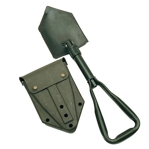 Pelle pliante type US livrée dans sa housse en polyester. Dans un coloris kaki, la pelle est d’une longueur dépliée de 58 cm et d’un poids d’environ 1,2 g.