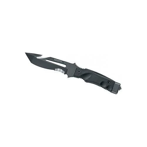 Couteau de 27cm, le Navita se distingue par sa lame atypique de style Tanto qui possède un coupe corde. Celle-ci mesure 13cm de long et fait 6mm d’épaisseur, elle est en acier inoxydable N690Co. Le manche en FORPRENE quand à lui est très ergonomique pour épouser parfaitement la forme de votre main. De plus il est muni d’un brise vitre.