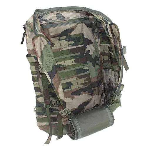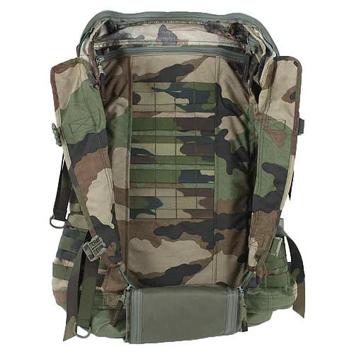 Il présente une ouverture faciale presque intégrale allant du haut du sac jusqu’au quart de la partie inférieure. Ce rabat est muni de deux poches. Au sommet du sac sont disposées deux ouvertures relativement vastes, fermées par des fermetures à glissières, pouvant servir de passage d’antennes ou de sortie de pipe de poche à eau, mais aussi d’accès latéral à un poste radio ou à d’autres accessoires.