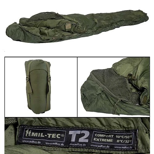 Sac de couchage tactical 2 Miltec. Extérieur: 100% nylon, Doublure: 100% nylon, Garnissage: 100% polyester. Température de confort: 10°C / température extrême: 0°C. Dimensions: 2.2 x 0.7m / conditionné: 37 x 20cm. Poids: 1.45kg. Couleur: vert.