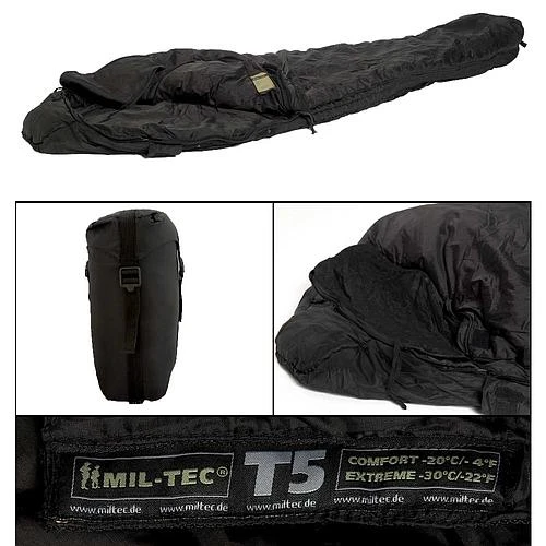 Sac de couchage tactical 5 Miltec. Extérieur: 100% nylon, Doublure: 100% nylon, Garnissage: 100% polyester. Température de confort: -20°C / température extrême: -30°C. Dimensions: 2.2 x 0.7m / conditionné: 43 x 28cm. Poids: 2.08kg. Couleur: noir.