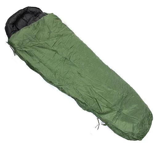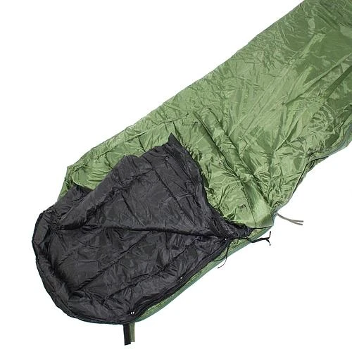 Le sac de couchage extérieur, vert olive, d’un poids de 1.200 g est garni d’un matelas de150 g/m² de fibres creuses. L’extérieur est aussi 190T polyester ripstop. Ses boutons pression sur la face externe de ce sac de couchage permettent éventuellement de solidariser un matelas ou un sur sac.
