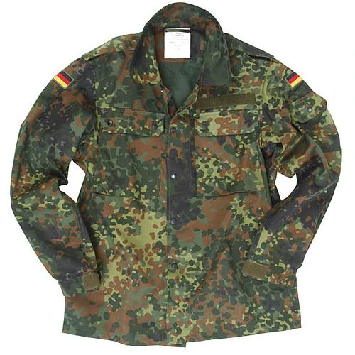 La veste militaire BW flecktarn est composé de 65% coton et de 35% polyester. Fermeture par bouton pression sur la face avant. Elle dispose de deux poches avant qui elles aussi se ferment par bouton pressions. La veste possède deux logos drapeaux allemand sur le bas des épaules ainsi qu’une poche sur le haut de la manche droite.